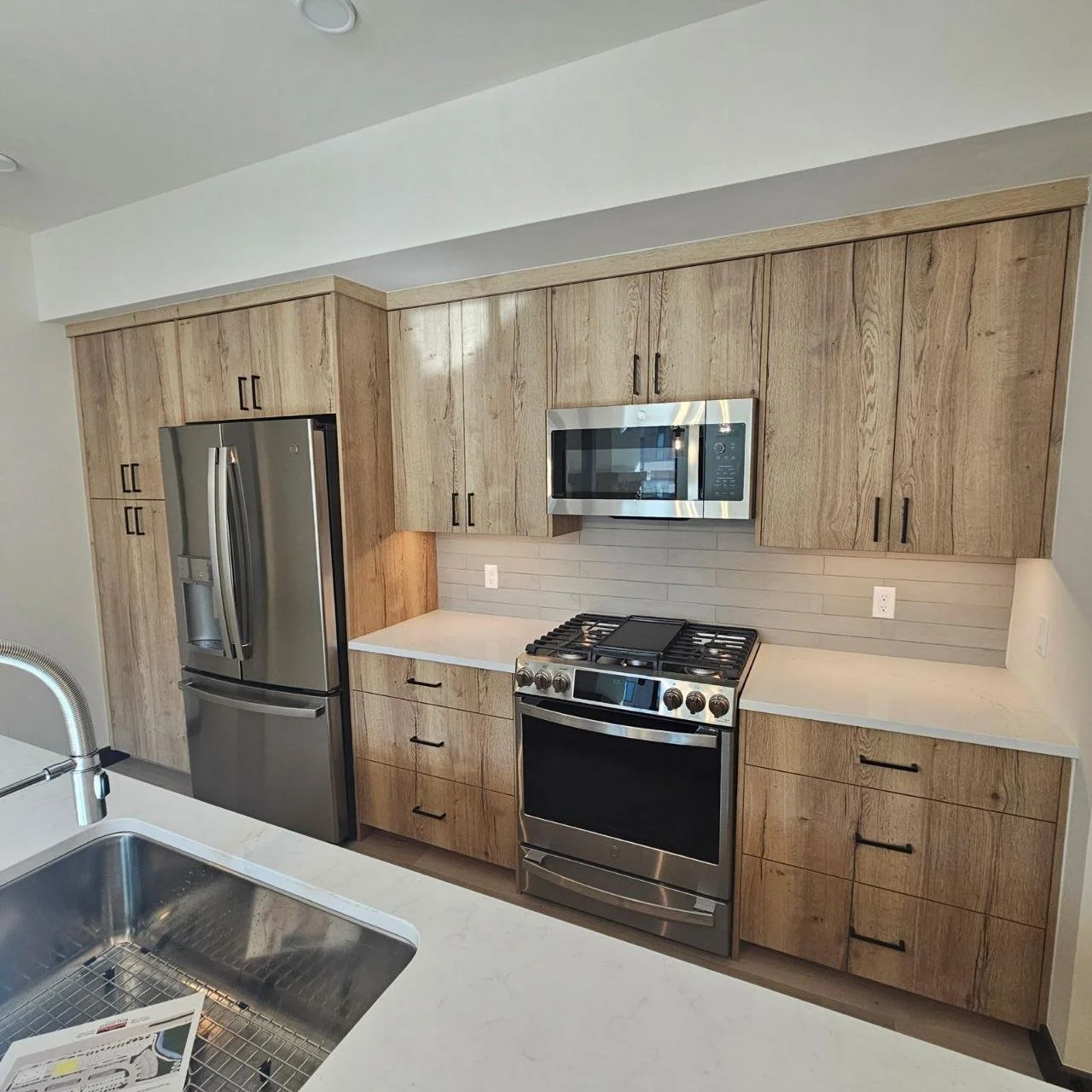 We work with both store-bought cabinets and custom designs, and we’ll make sure everything fits right — from leveling and anchoring to trim and hardware.