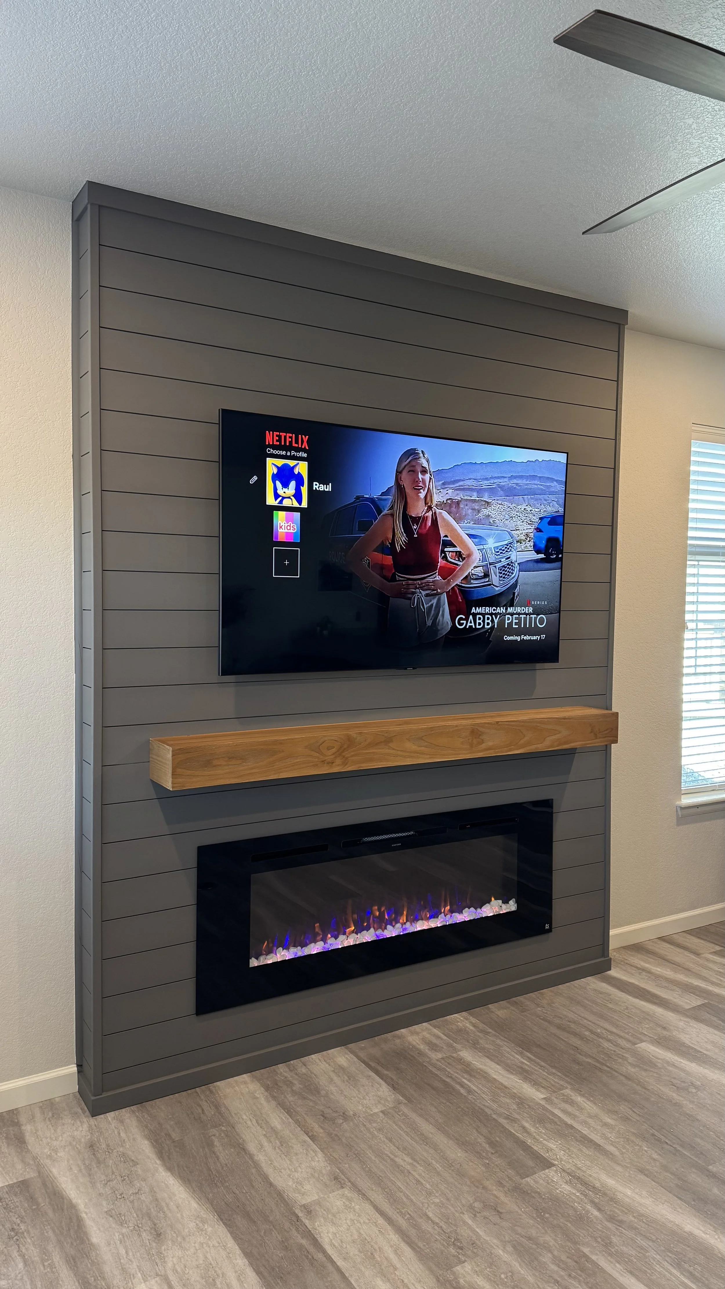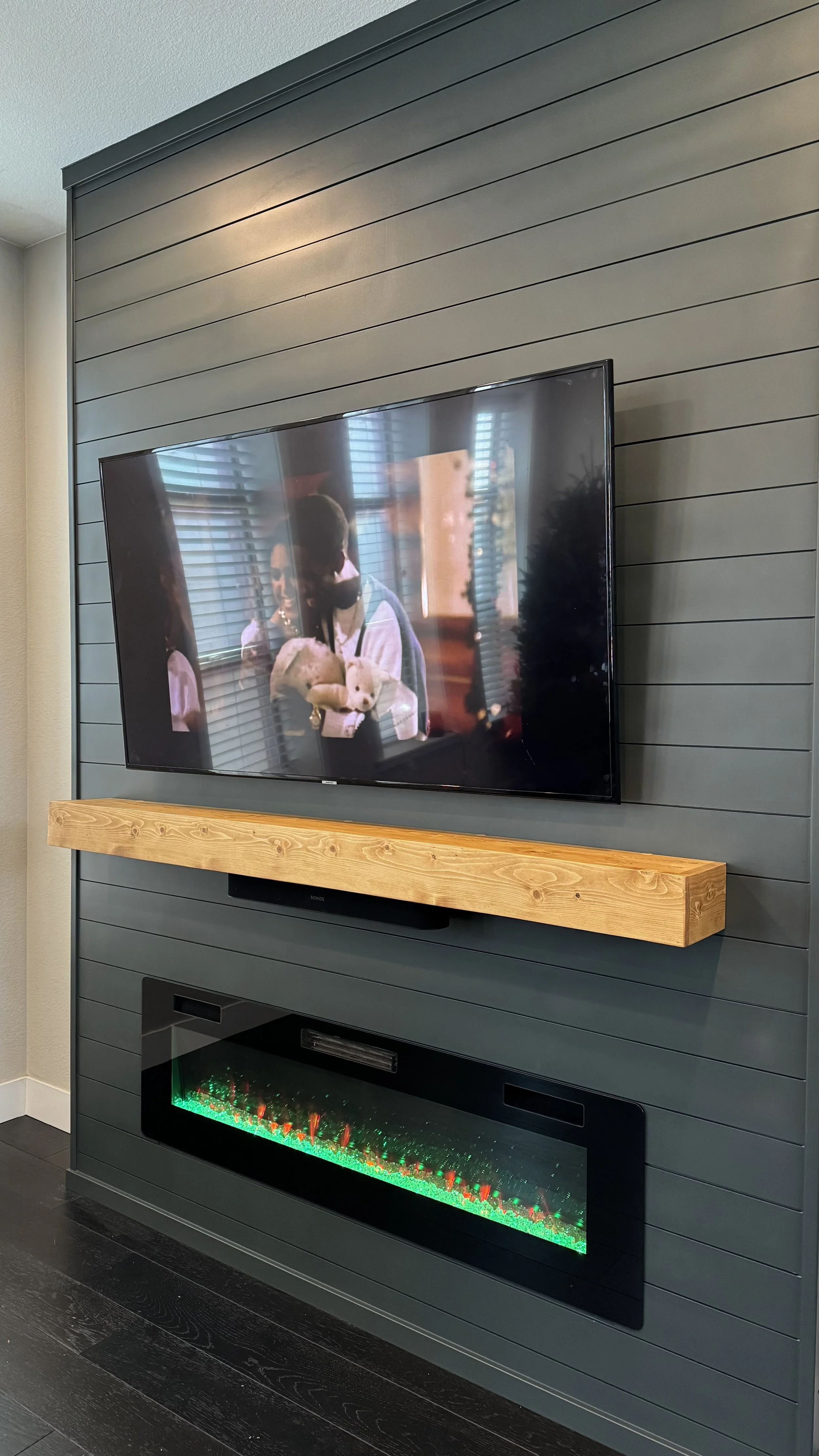 A shiplap fireplace wall connects several HandyRex services in a single installation.