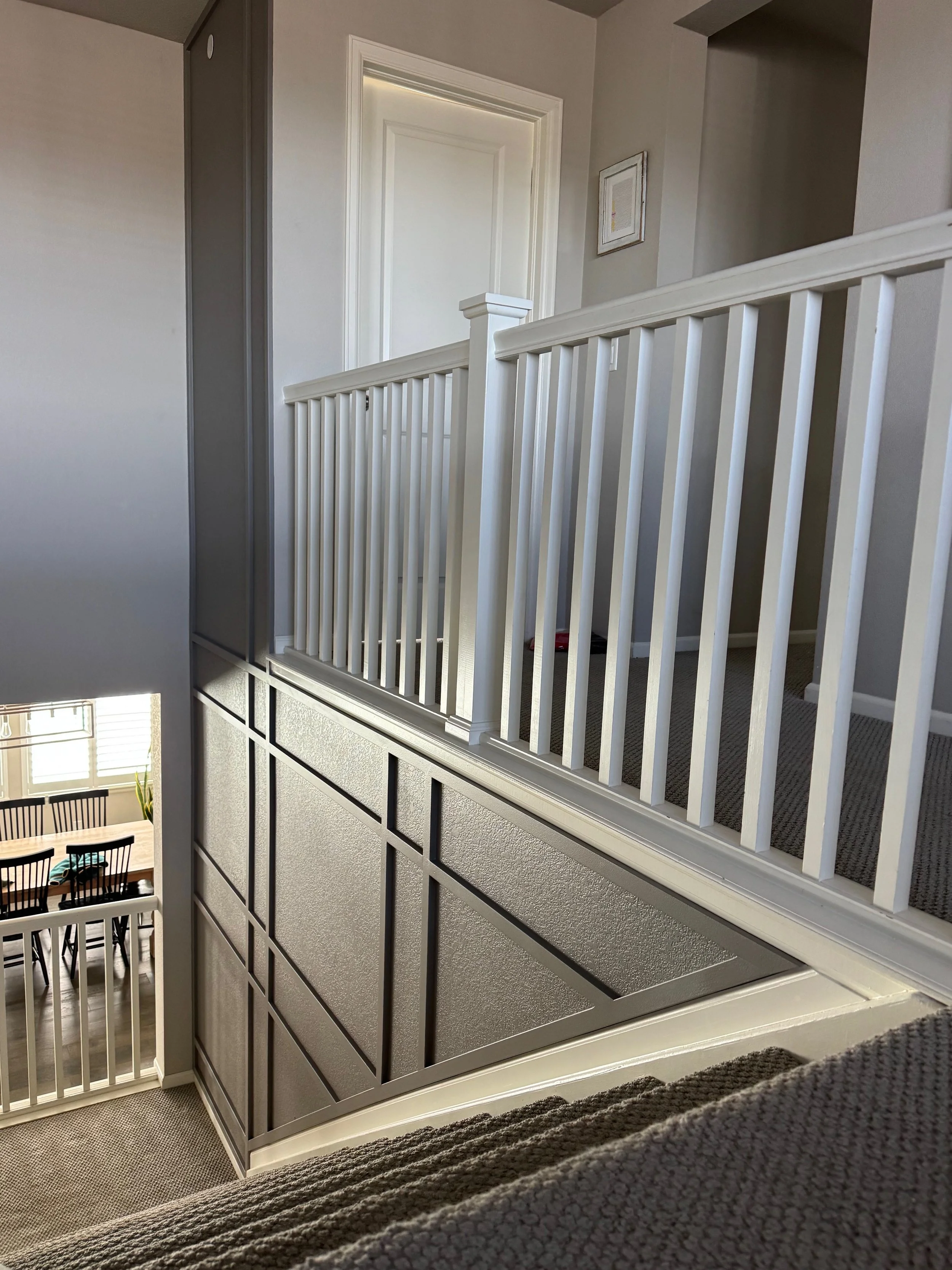 The finished staircase accent wall transformed an empty vertical space into a strong architectural feature. The board and batten design enhances the flow between floors and adds long-term value through clean carpentry and timeless styling.